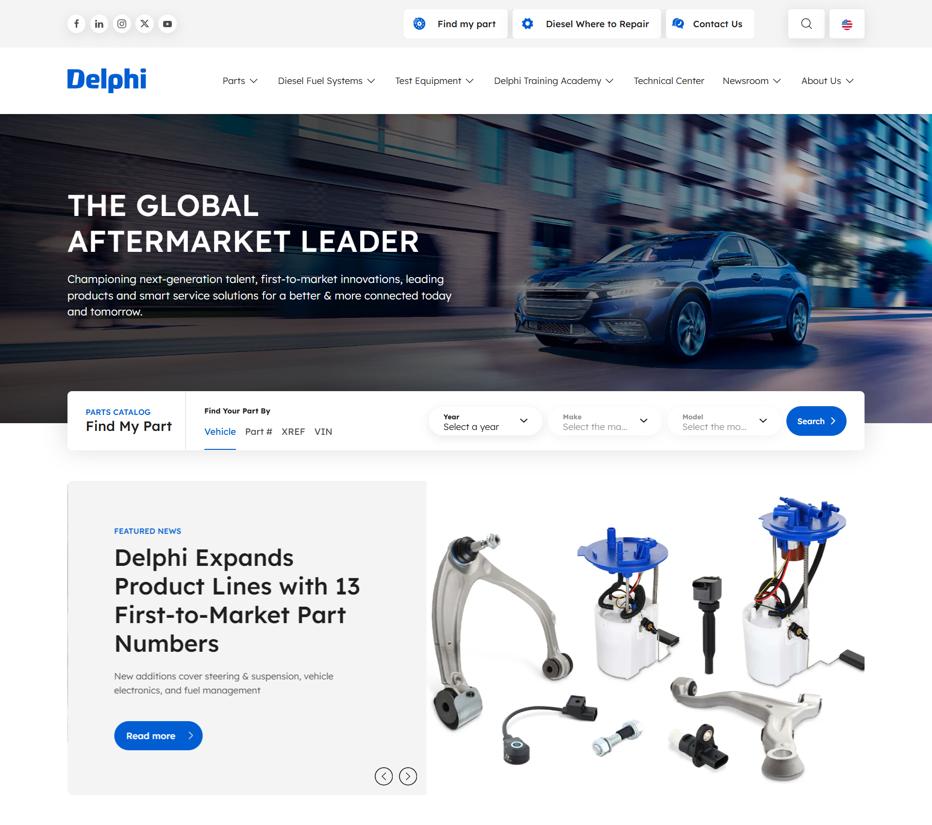 Led the frontend migration of Delphi Autoparts' public platform from a WordPress monolith to a modern Next.js architecture. Delphi is a global aftermarket leader with presence in 150+ countries and a network of 2,750+ service centers, now operating under PHINIA Inc. My focus was on rebuilding the product pages and main navigation — the highest-traffic sections of the site — while leading a small frontend team through the transition.