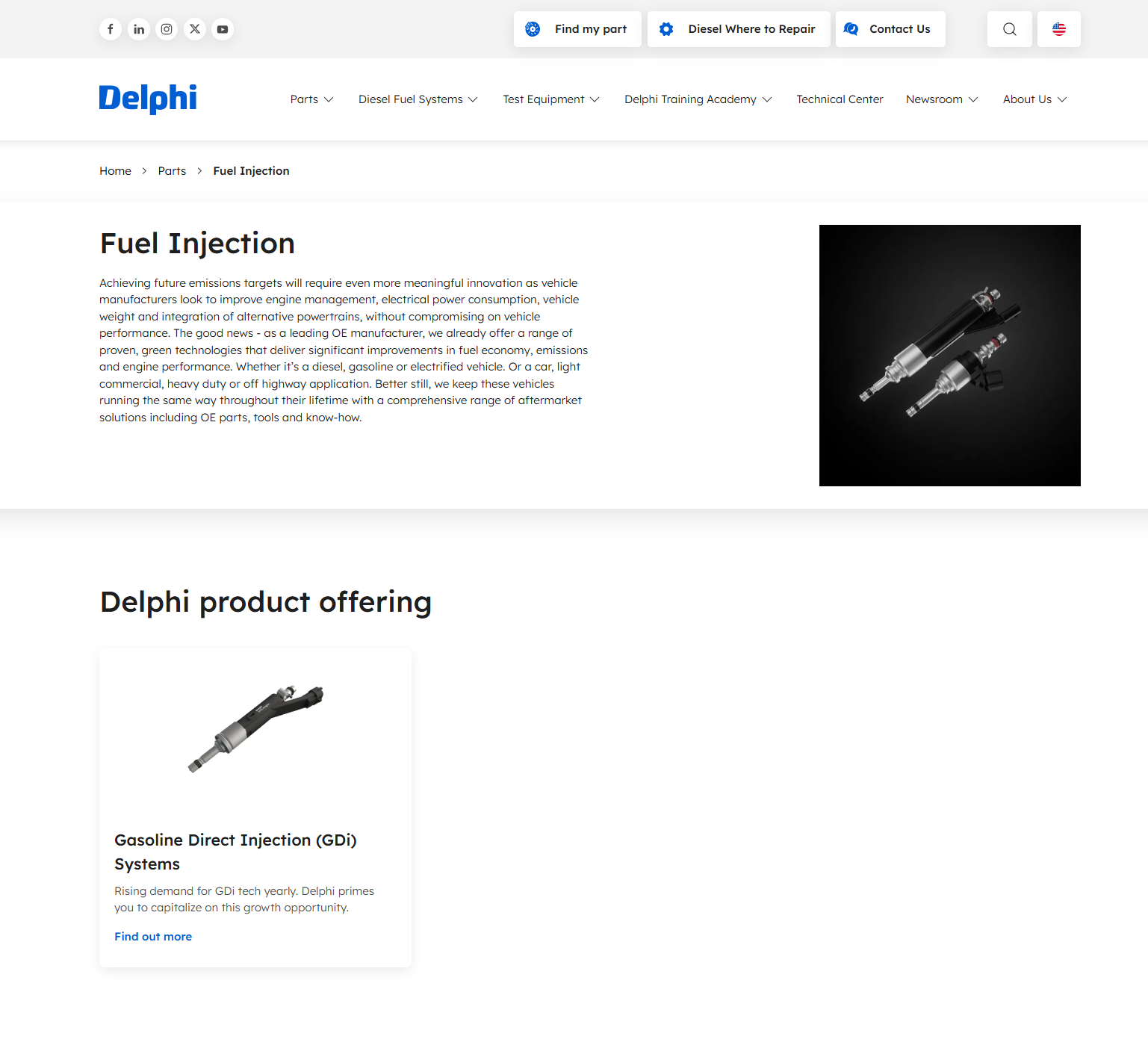 Rebuilt the product pages that serve as the core browsing experience for technicians, mechanics, and distributors looking up Delphi's parts catalog across multiple categories: fuel injection, fuel management, chassis, ignition, power electronics, and test equipment.