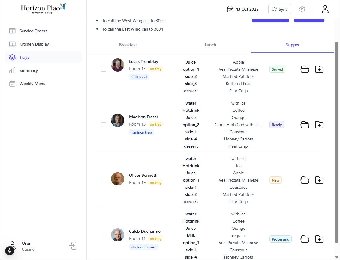 Staff need to know which meals have been ordered, prepared, and delivered — and residents want to know when their meal is coming.